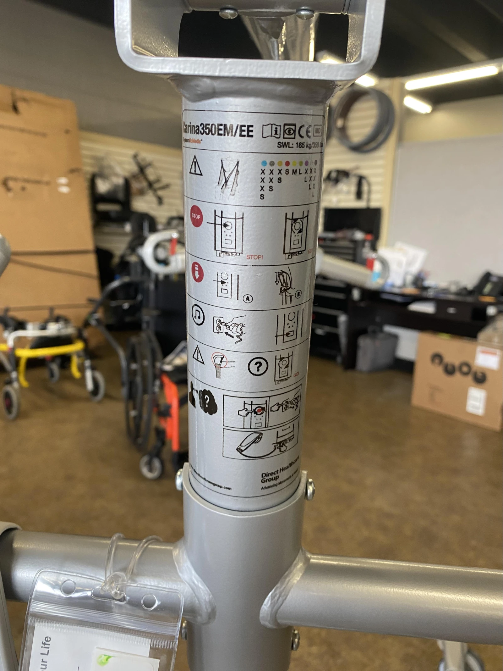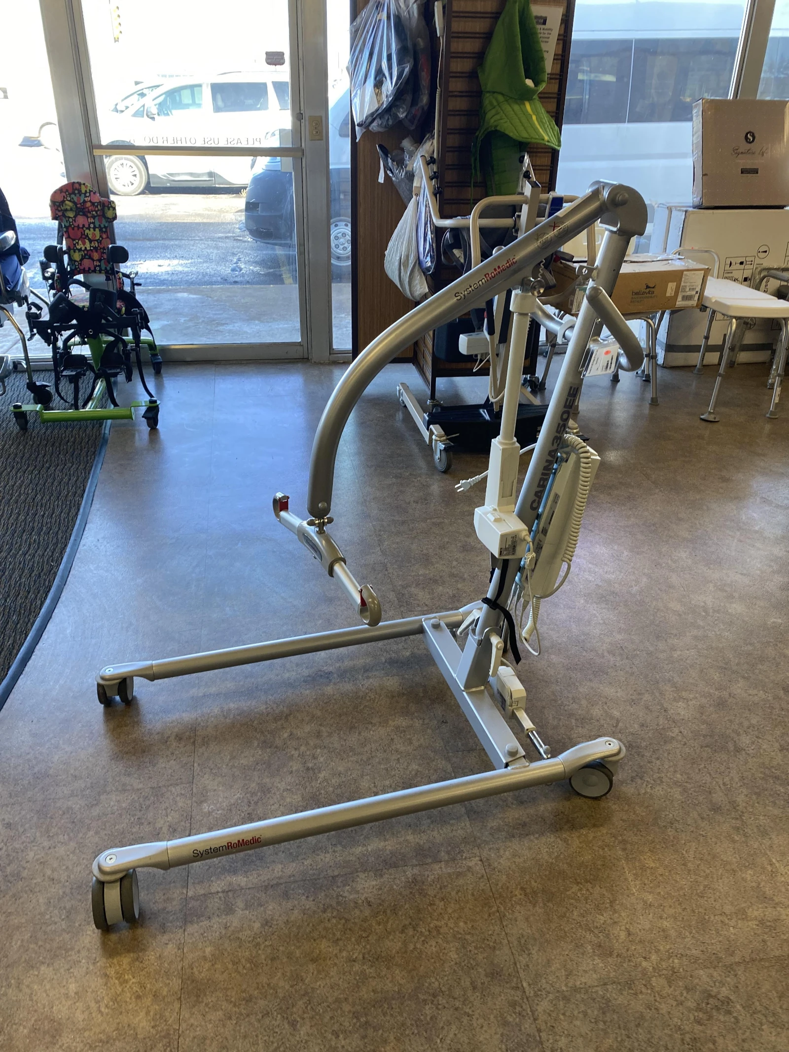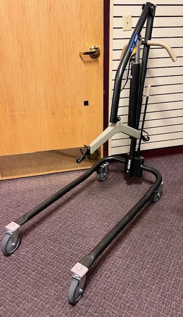 Equipped with a motorized base to easily adjust wheel width, the Handicare Carina350EE is a portable electric patient lift with an exceptionally-large lifting range - excellent for low and high lifting. Weight capacity is 350 lbs. Collapsible, sturdy, stable, lightweight. Sling not included.
